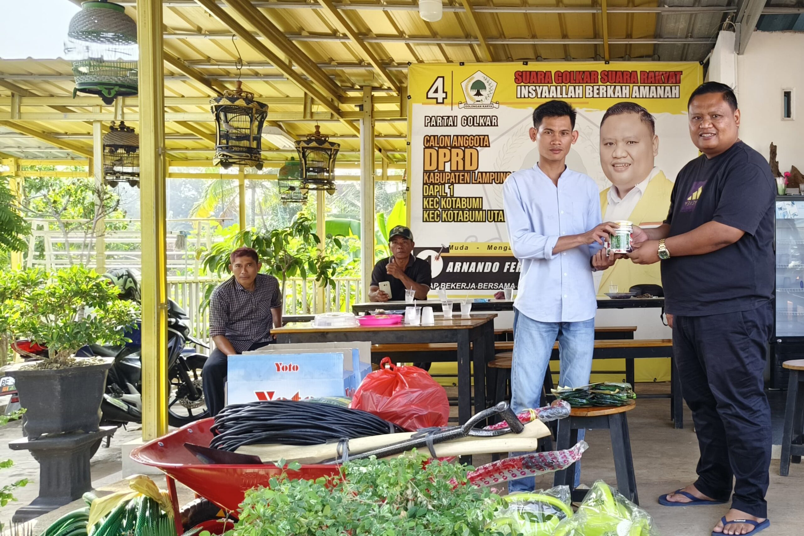 Informasi terhimpun, tak tanggung-tanggung, Arnando Ferdiansyah, anggota DPRD Lampung Utara Fraksi Partai Golkar periode 2024-2029, memberikan bantuan berupa selang air sepanjang 100 m, pipa paralon, cangkul, kabel listrik, angkong, paranet, pupuk kompos, ember kocor, dua unit tangki semprot, sekop, waring, serta beragam benih tanaman sayuran dan buah.