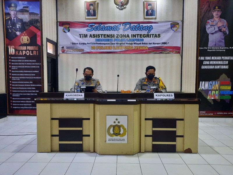 LAMPUNG UTARA (RNSI/SMSI) – Tim Asistensi Zona Integritas Birorena Polda Lampung Kunjungi Polres Lampung Utara dalam rangka penilaian Pembangunan Zona Integritas Menuju Wilayah Bebas Dari Korupsi (WBK) di Polres setempat, Kamis lalu, 16 September 2021.