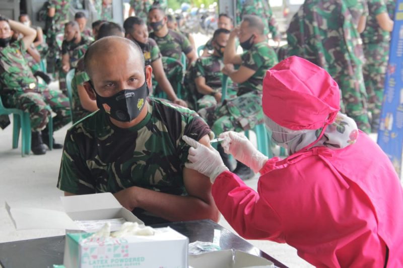 Pelaksanaan vaksinasi sendiri melalui tahapan – tahapan, seperti pendaftaran peserta, pengecekan tekanan darah, suhu tubuh, skrining hingga akhirnya prajurit menerima suntikan vaksin Covid – 19 dan terakhir dilakukan observasi.