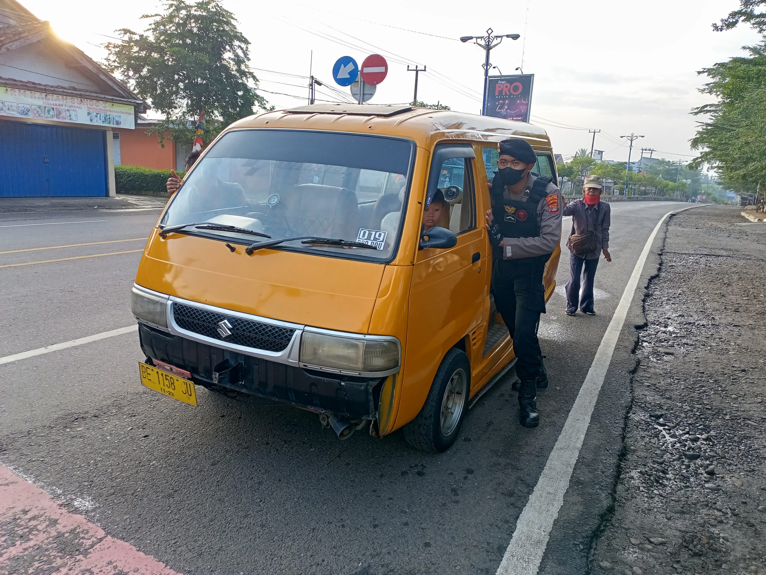 Melihat situasi itu, dengan sigap polisi yang sedang berjaga di persimpangan lampu merah jalan Letkol. A. Rivai, Kotabumi itu pun membantu meminggirkan angkot yang berpenumpang seorang lelaki paruh baya dan seorang anak kecil.