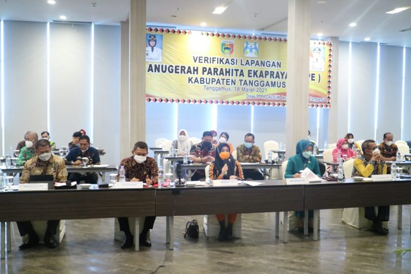 BANDARLAMPUNG (RNSI/SMSI) — Bupati Tanggamus Hj. Dewi Handajani bersama Tim Driver Pengendali Anugerah Parahita Ekapraya (APE) Kabupaten Tanggamus, mengikuti Verifikasi Lapangan secara virtual meeting Anugerah Parahita Ekapraya Tahun 2021, yang ditempatkan di Meeting Room Hotel Novotel Bandar Lampung, Kamis kemarin, 18 Maret 2021.