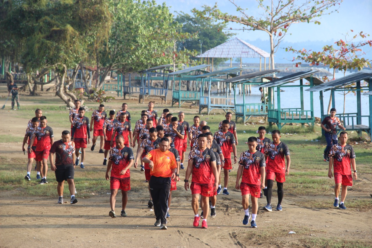 Olahraga diawali dengan doa, senam peregangan dan selanjutnya melaksanakan jalan sehat keliling Mako Brigif 4 Marinir/BS dan berakhir di pantai Marine Eco Park.