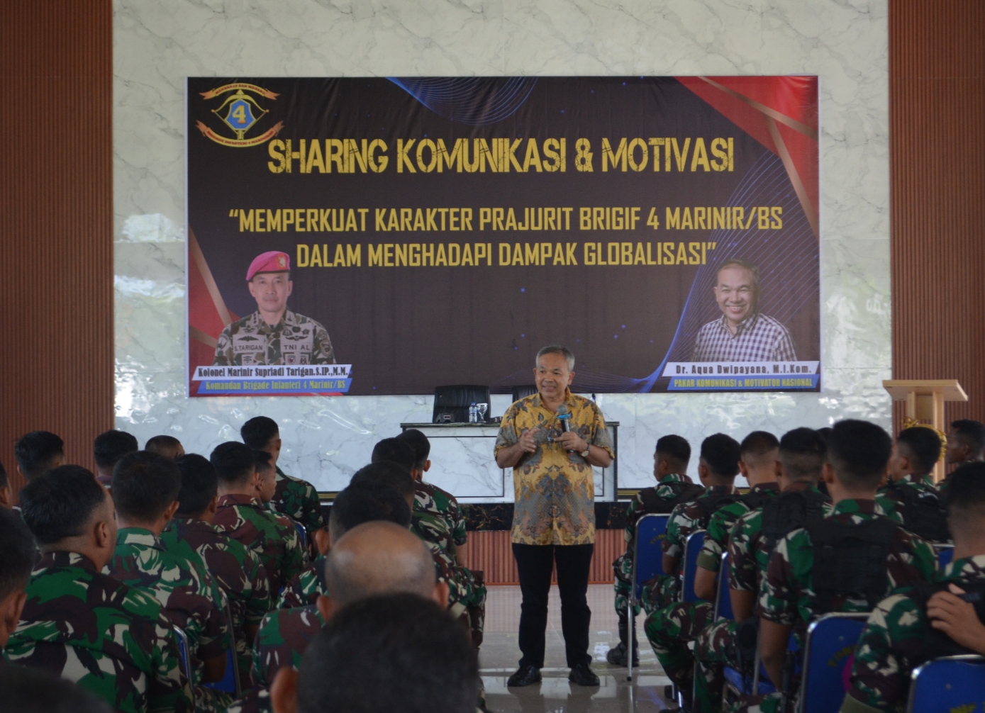 Kegiatan ini menghadirkan Dr. Aqua Dwipayana, seorang motivator ternama di Indonesia, dan berlangsung di Kesatrian Yonif 7 Marinir Ketapang, Kecamatan Telukpandan, Kabupaten Pesawaran, pada Rabu kemarin, 31 Juli 2024.