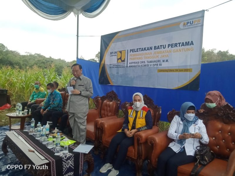 Terkait hal tersebut, anggota Komisi V DPR-RI, Drs. Hi. Tamanuri, MM, beserta jajaran, yang didampingi anggota Komisi II DPRD Provinsi Lampung, Mardiana, ST, MT, melaksanakan peletakan batu pertama pembangunan jembatan gantung penghubung antara Desa Pampangtangguk Jaya, Kecamatan Sungkai Tengah menuju Desa Negarakemakmuran, Kecamatan Hulusungkai, Lampung Utara, Jum’at, 4 Juni 2021.