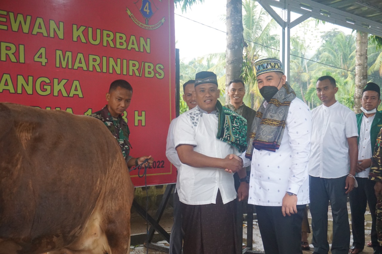 Danbrigif 4 Marinir/BS Kolonel Marinir Harry Indarto bersama Bupati Pesawaran, H. Dendi Ramadhona, menyerahkan secara simbolis hewan kurban berupa sapi kepada panitia kurban usai pelaksanaan shalat Idul Adha.