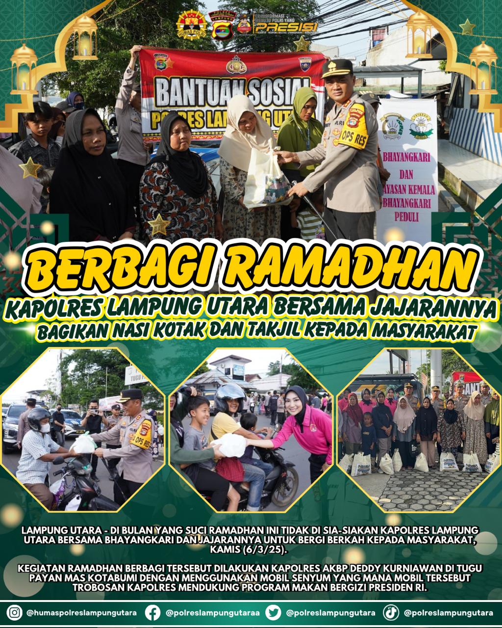 Kapolres Lampung Utara AKBP Deddy Kurniawan menyampaikan, bahwa kegiatan ini bertujuan untuk mempererat hubungan antara Kepolisian dan masyarakat serta meningkatkan kepedulian sosial di bulan Ramadan.