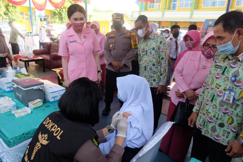 Vaksinasi yang dihadiri Kapolres Lampung Utara AKBP Kurniawan Ismail S.H., S.I.K., M.I.K dan Ketua Bhayangkari Cabang Ny. Diana Kurniawan Ismail bersama para pengurus itu, bertempat sekolah / YKB Kotabumi Lampung Utara, Kamis (30/9/2021)