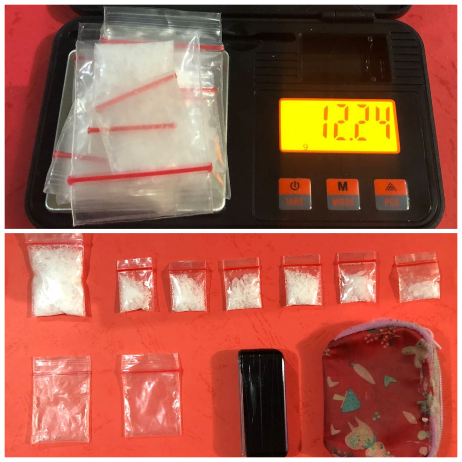 Dari tangan tersangka ditemukan barang bukti berupa sejumlah tujuh kemasan plastik klip berisikan butiran kristal bening yang diduga narkotika jenis sabu dengan berat bruto 12,24 gram.
