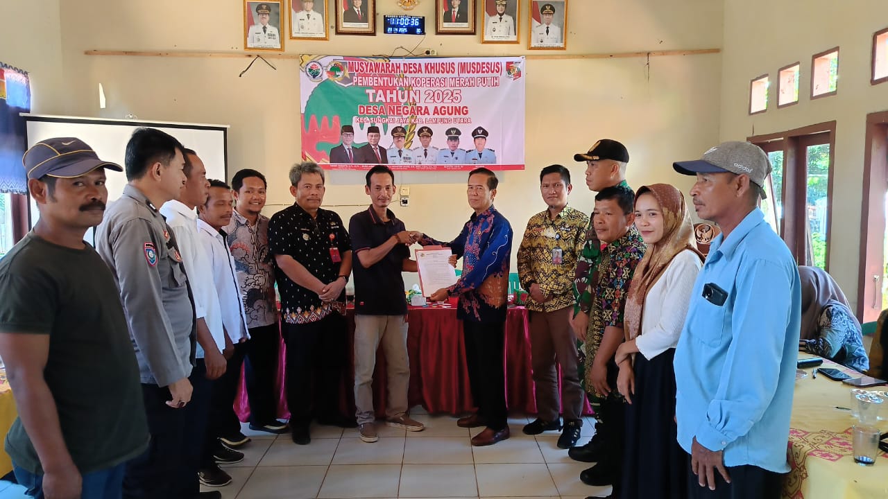 LAMPUNG UTARA (RNSI) – Pemerintah Desa Negara Agung, Kecamatan Sungkaijaya, menggelar Musyawarah Desa Khusus (Musdessus) dalam rangka pembentukan Koperasi Desa (Kopdes) Merah Putih, sesuai dengan pedoman instruksi presiden (inpres) nomor 9 tahun 2025 dan Edaran Kemendesa PDT nomor 6 tahun 2025 serta petunjuk pelaksanaan Kemenkop.