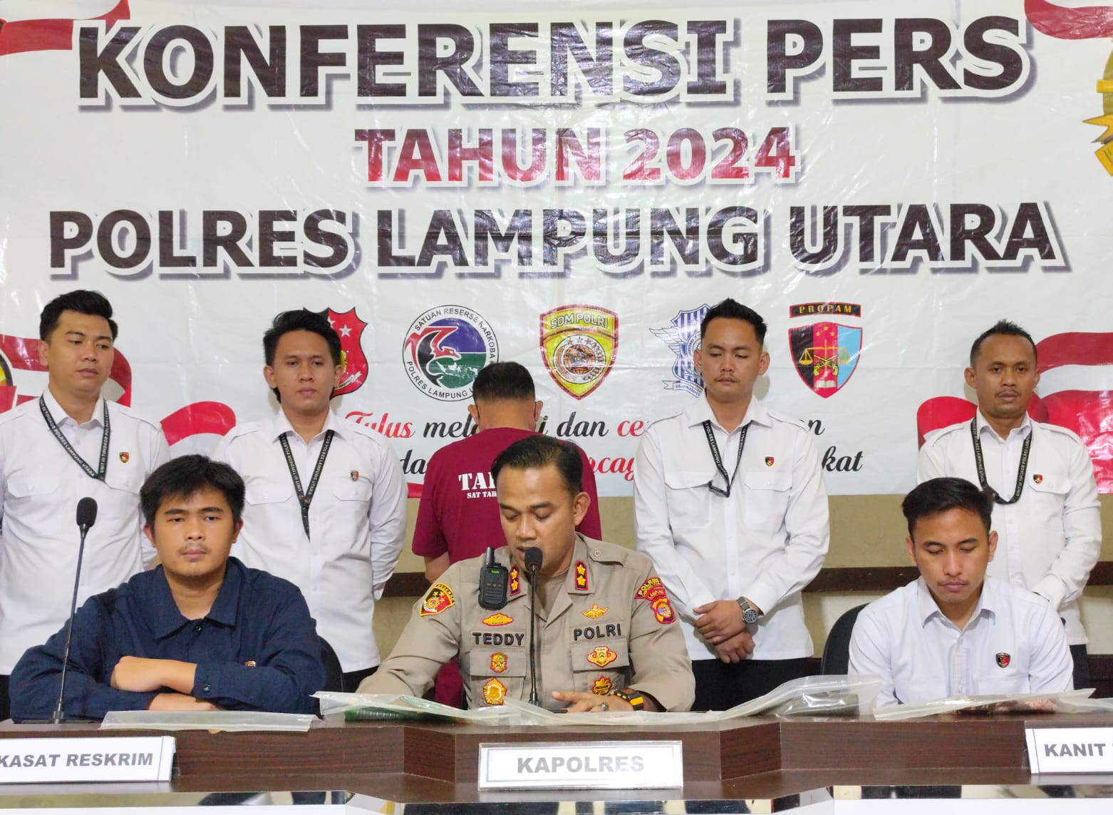 Lanjut Kapolres, setelah dilakukan penyidikan dan berdasarkan alat bukti berupa keterangan saksi – saksi, Dokumen Surat, Keterangan Ahli dan Hasil Audit Penghitungan Kerugian Keuangan Negara sebesar 230 juta dari Inspektorat Lampung Utara, maka terhadap R kita tetapkan menjadi tersangka.