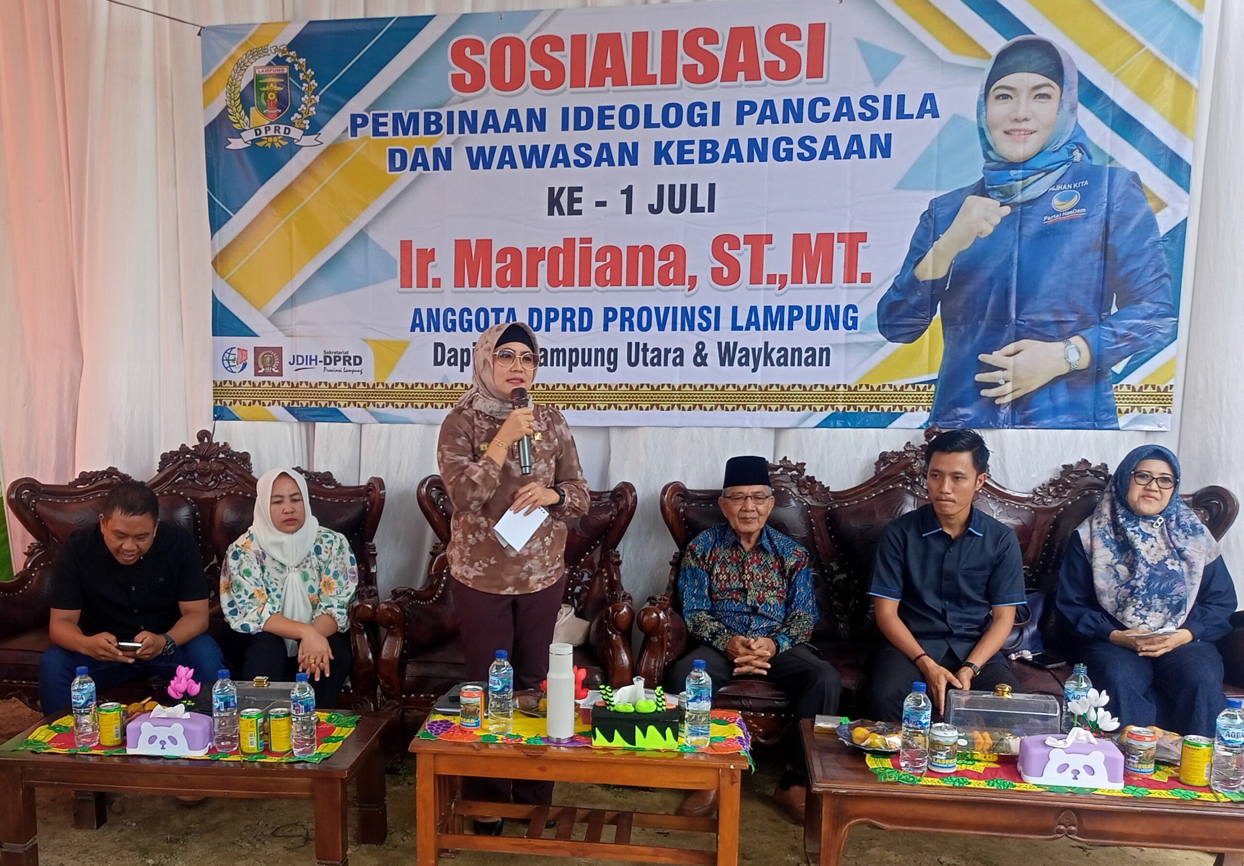 LAMPUNG UTARA (RNSI) – Guna meningkatkan pemahaman masyarakat tentang nilai-nilai Pancasila dan Wawasan Kebangsaan, Wakil Ketua Komisi V DPRD Provinsi Lampung, Ir. Mardiana, S.T., M.T., melaksanakan agenda kerja rutin Sosialisasi Pembinaan Ideologi Pancasila dan Wawasan Kebangsaan (IPWK).