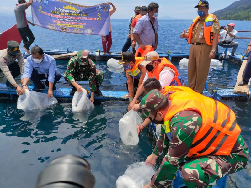 Danrem 043 Gatam, Brigjen TNI Toto Jumariono, dalam sambutannya menyampaikan kunjungan kerjanya dilaksanakan untuk melepaskan bibit benih ikan karapu budidaya laut.