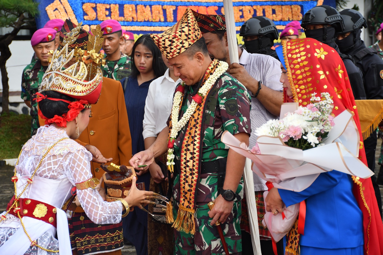 Foto Utama: Dan Brigif 4 Mar/BS Kolonel Mar Supriadi Tarigan disambut dengan tari Sigegh Pengutten. Foto: ist.