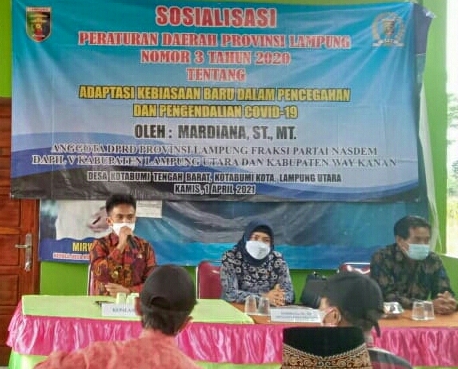 LAMPUNG UTARA (RNSI/SMSI) – Anggota Komisi II DPRD Provinsi Lampung, Mardiana, ST., MT., menyosialisasikan Peraturan Daerah Prov. Lampung No. 3/2020, tentang Adaptasi Kebiasaan Baru dalam Pencegahan dan Pengendalian Covid-19, yang dipusatkan di Balai Desa Kotabumi Tengah Barat, Kecamatan Kotabumi, Lampung Utara, Kamis, 1 April 2021.