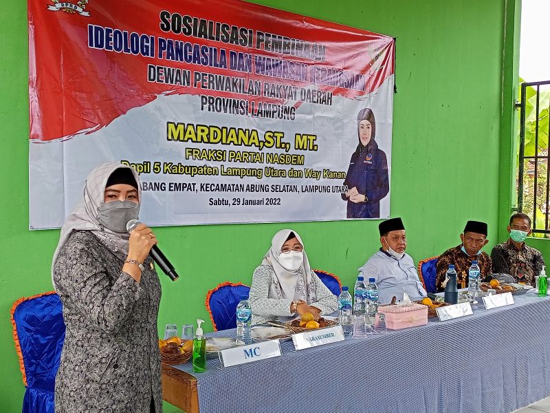 LAMPUNG UTARA (RNSI/SMSI) – Anggota Fraksi Partai NasDem Komisi IV DPRD Provinsi Lampung, Mardiana, ST, MT, sosialisasikan Pembinaan Ideologi Pancasila dan Wawasan Kebangsaan.