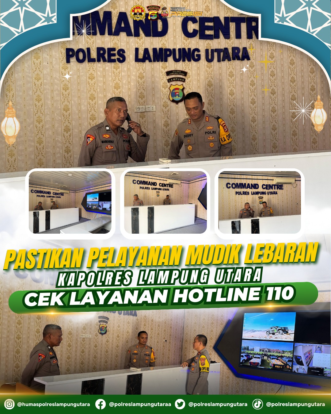 LAMPUNG UTARA (RNSI) – Untuk memastikan pelayanan kepada masyarakat yang akan mudik lebaran Idul Fitri 2025 sudah berjalan maksimal, Kapolres Lampung Utara mengecek langsung layanan call center 110 Polres setempat, Kamis (13/3/25).