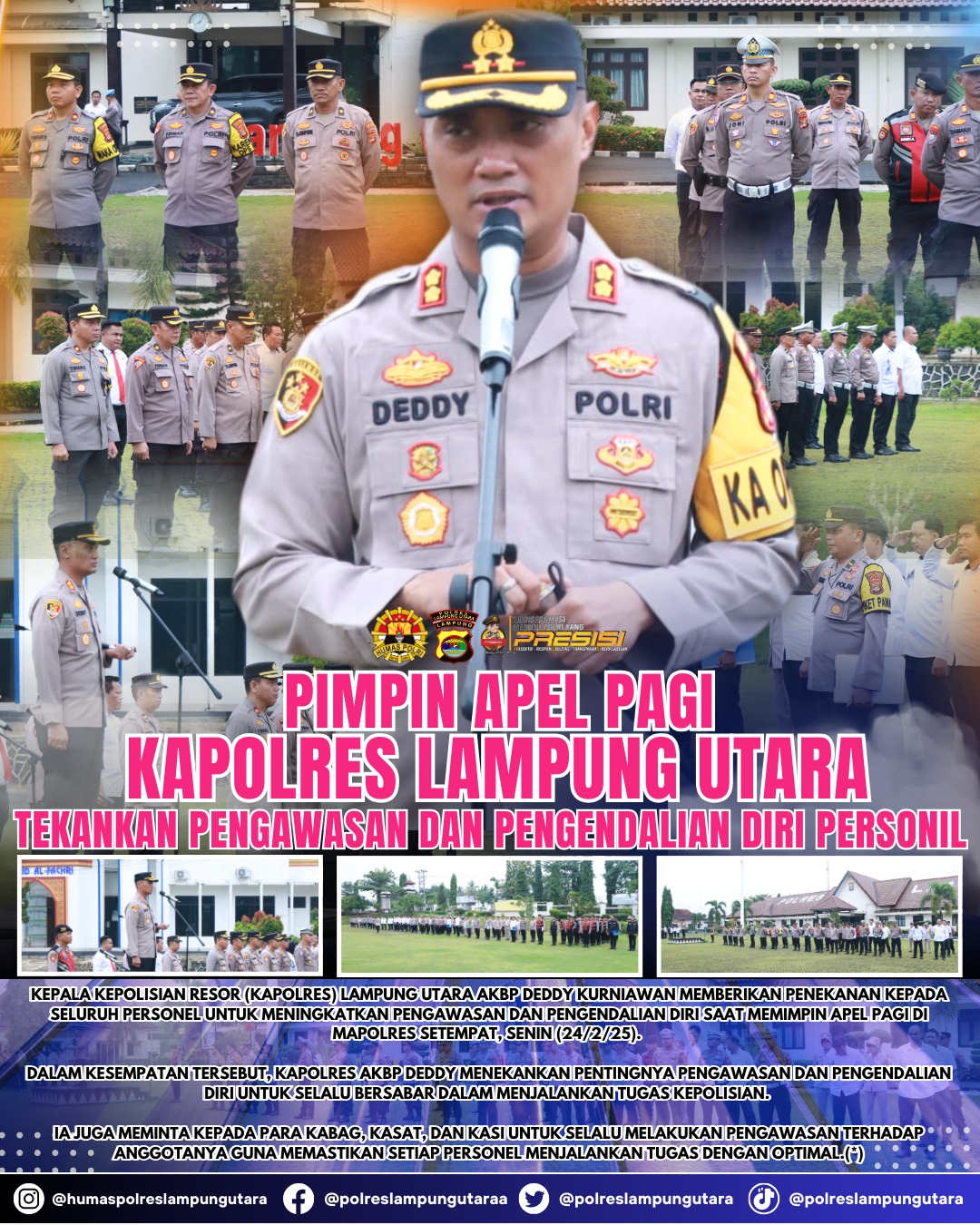 LAMPUNG UTARA (RNSI) – Kepala Kepolisian Resor (Kapolres) Lampung Utara AKBP Deddy Kurniawan memberikan penekanan kepada seluruh personel untuk meningkatkan pengawasan dan pengendalian diri saat memimpin apel pagi di Mapolres setempat, Senin (24/2/25).