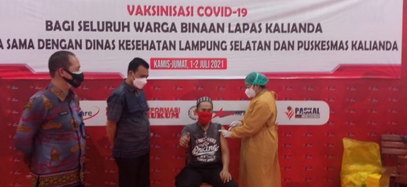 KALIANDA (RNSI/SMSI) – Plt Kakanwil Kemenkum HAM Lampung, Ida Asep Somara, meninjau pelaksanaan kegiatan vaksinasi Covid-19 di hari kedua bagi sejumlah 699 Warga Binaan Pemasyarakatan (WBP) yang berada Lapas Kalianda, Jum’at kemarin, 2 Juli 2021.