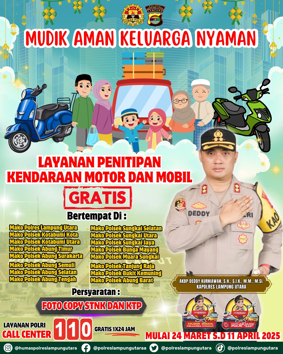 “Kami mengimbau masyarakat yang akan mudik untuk memanfaatkan layanan penitipan kendaraan ini. Kendaraan dapat dititipkan di kantor Polres Lampung Utara maupun di Polsek jajaran secara gratis, kata Kapolres. Selasa (25/3/25).