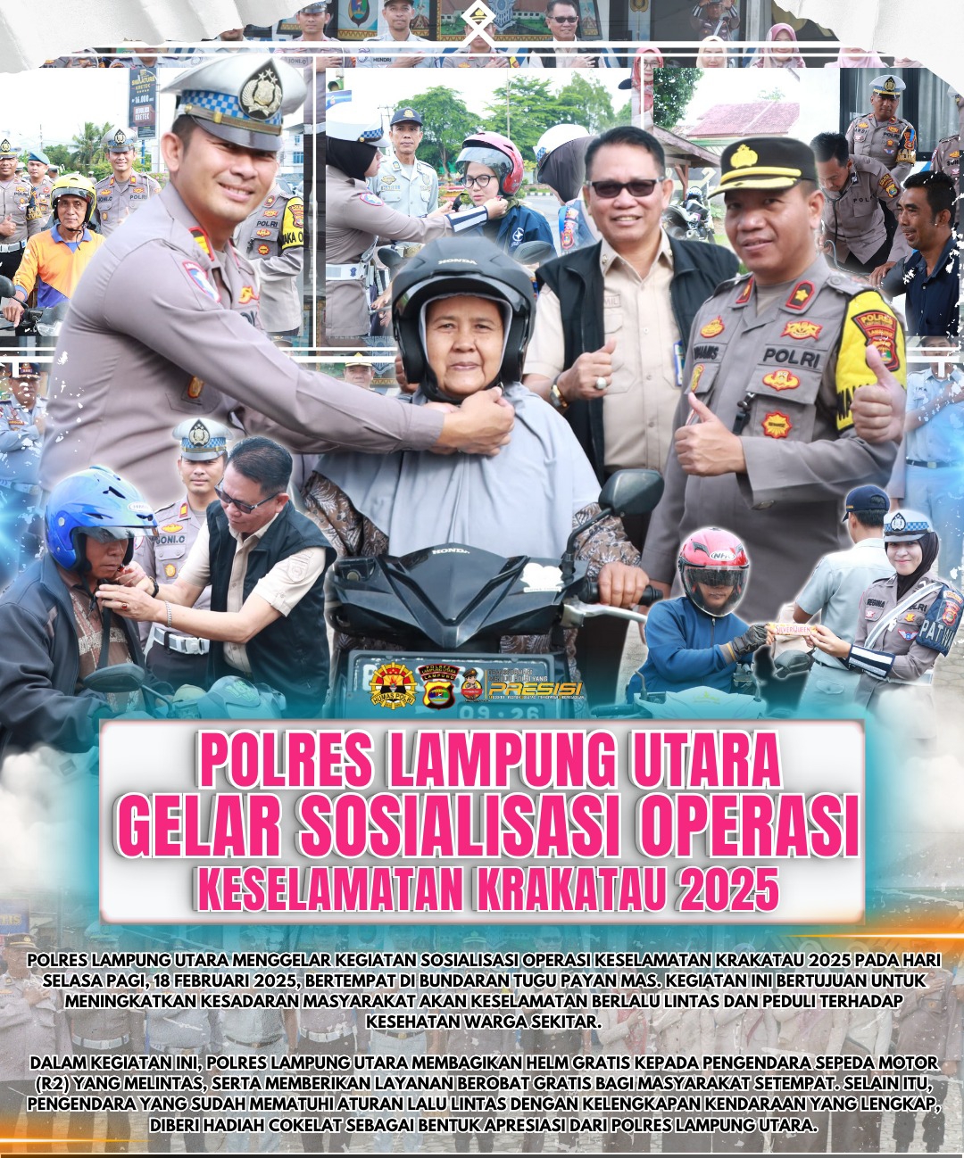 LAMPUNG UTARA (RNSI) – Polres Lampung Utara menggelar kegiatan Sosialisasi Operasi Keselamatan Krakatau 2025 pada hari Selasa pagi, 18 Februari 2025, bertempat di Bundaran Tugu Payan Mas. Kegiatan ini bertujuan untuk meningkatkan kesadaran masyarakat akan keselamatan berlalu lintas dan peduli terhadap kesehatan warga sekitar.