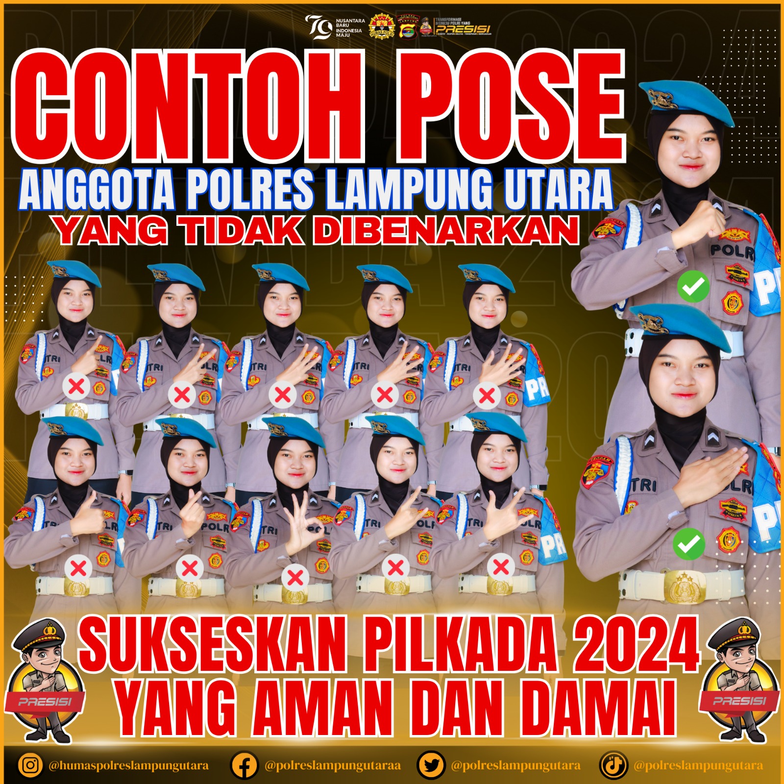 LAMPUNG UTARA (RNSI) – Kepolisian Resor (Polres) Lampung Utara telah mengeluarkan larangan ketat terhadap personelnya untuk tidak pose jari saat berfoto di tahun Pemilihan Kepala Daerah (Pilkada) serentak Tahun 2024.
