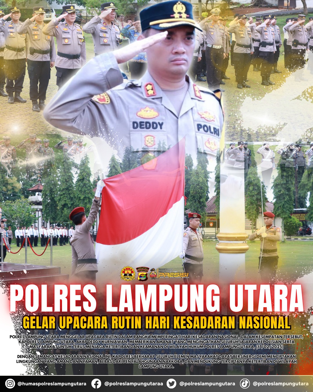LAMPUNG UTARA (RNSI) – Polres Lampung Utara menggelar upacara rutin dalam rangka memperingati Hari Kesadaran Nasional. Dalam kesempatan tersebut, Kapolres Lampung Utara, AKBP Deddy Kurniawan, memberikan amanat yang mengingatkan seluruh jajaran kepolisian serta masyarakat untuk terus menjaga ketertiban dan keamanan di wilayah Hukum Polres Lampung Utara, (17/02/2025).
