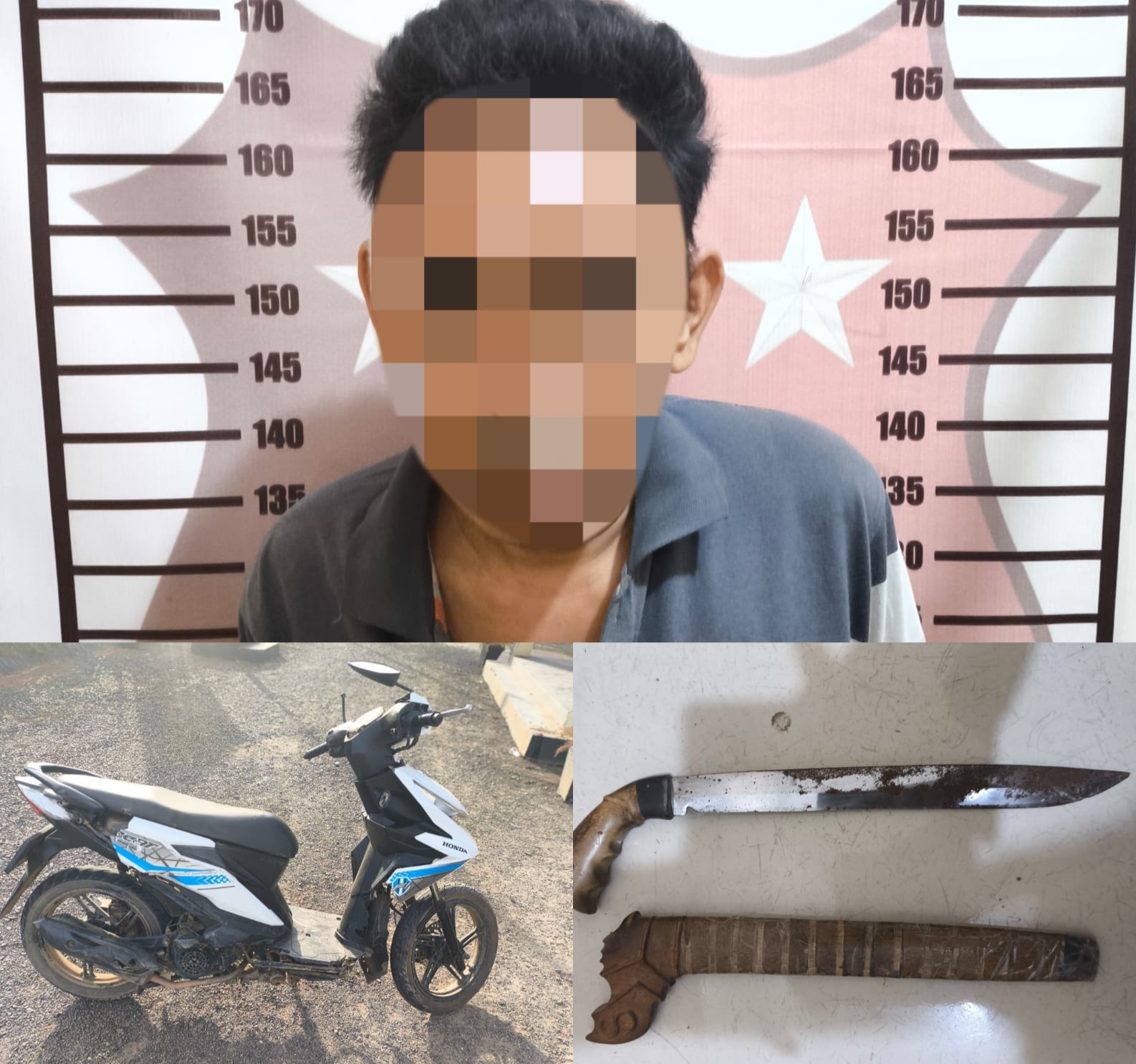 Dari tangan pelaku petugas juga mengamankan 1 bilah senjata tajam jenis laduk bergagang kayu warna, 1 helai sibo berwarna hitam, 1 kaos lengan panjang warna abu-abu corak hitam (pakaian milik pelaku) dan 1 unit Sepeda Motor Merk Honda Beat miliki korban.