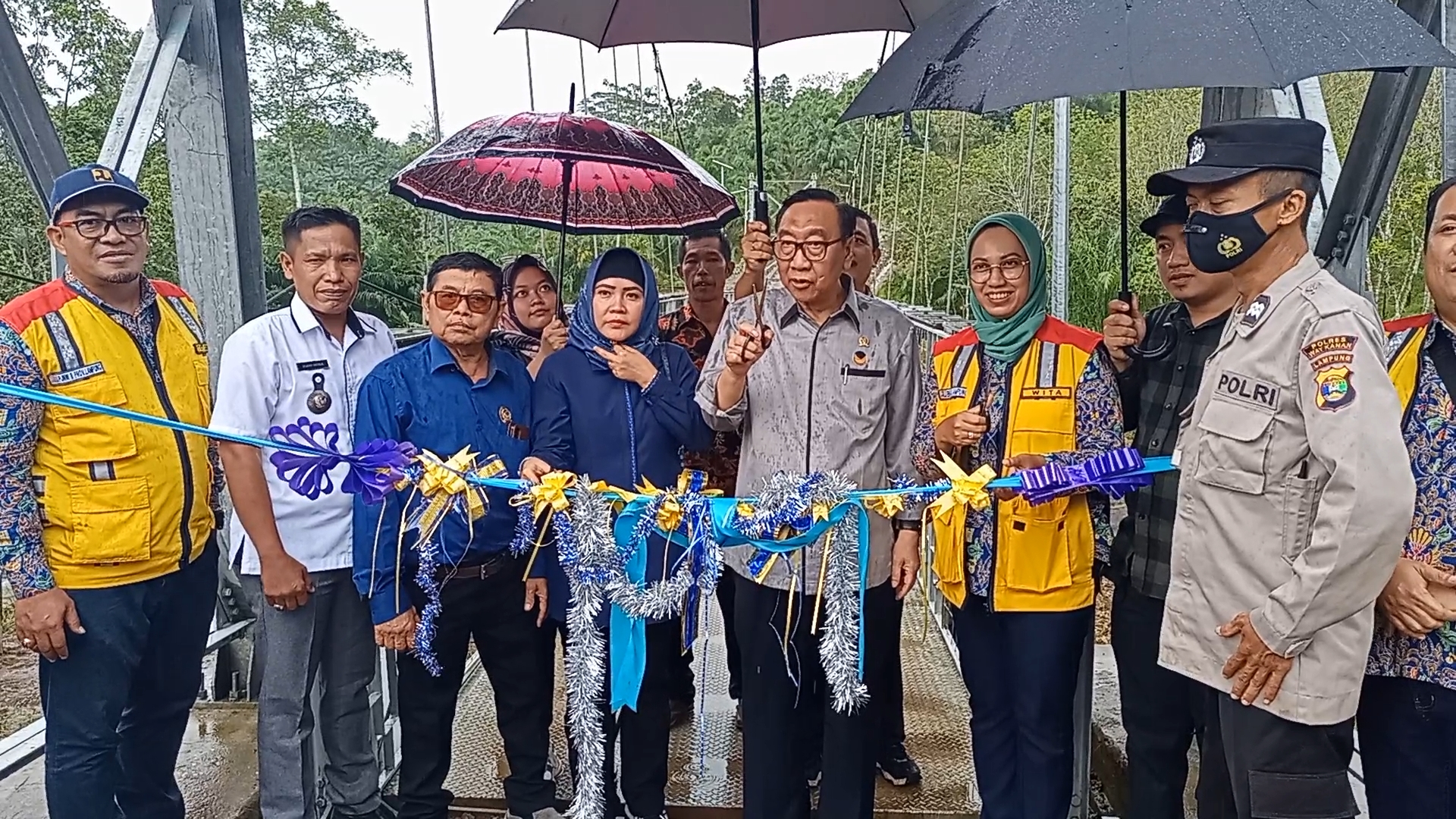 WAYKANAN (RNSI/SMSI) – Meski dalam guyuran hujan yang deras, pelaksanaan peresmian jembatan gantung Way Tahmi yang berada di Kampung Tanjung Tiga, Kecamatan Rebang Tangkas, Kabupaten Waykanan, pada Rabu, 27 Juli 2022, berlangsung dengan penuh keceriaan.