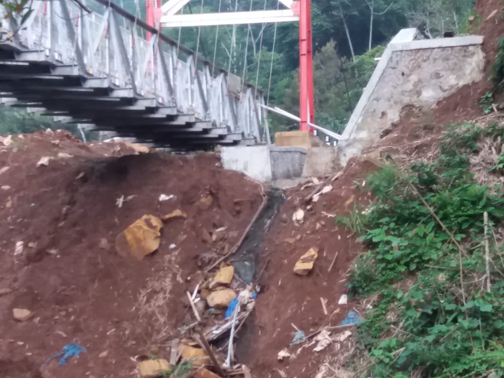 Termasuk pada pekerjaan Tembok Penahan Tanah (TPT) yang diduga dikerjakan asal-asalan dan tak sesuai spesifikasi, bahkan ada beberapa titik tebing yang tidak dipasang TPT dan mengakibatkan dinding tebing mulai mengalami longsor, yang membuat warga merasa was-was jika nantinya melewati jembatan gantung.
