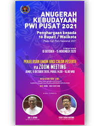 “Presentasi ini merupakan tahap akhir dari proses Anugerah Kebudayaan PWI Pusat. Kalau proses ini lolos, bupati/walikota tersebut berhak menerima trofi di acara puncak HPN yang biasanya dihadiri Presiden. Mengingat situasi pandemi, kami akan melakukan proses presentasi ini, dengan protokol kesehatan secara ketat,” ujar Yusuf Susilo Hartono selaku Pelaksana AK-PWI Pusat.