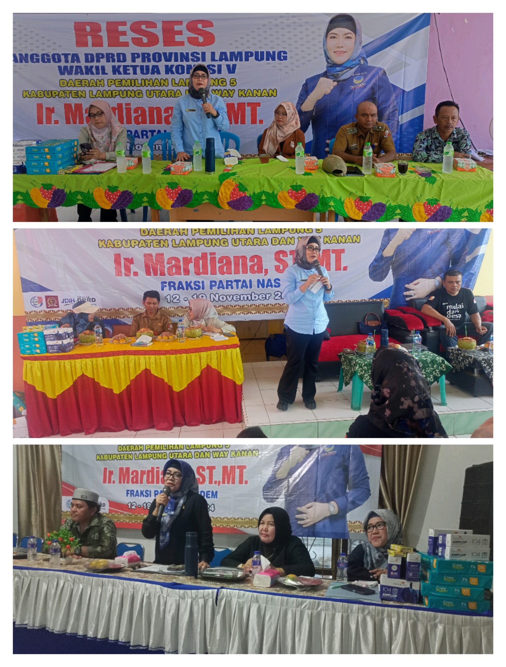 LAMPUNG UTARA (RNSI) – Wakil Ketua Komisi V DPRD Provinsi Lampung, Ir. Mardiana, S.T., M.T., melangsungkan kunjungan kerja reses di tiga desa yang dilaksanakan pada Selasa, 12 November 2024, terpusat di aula Desa Subik, aula Desa Neglasari, Kecamatan Abung Tengah; dan Desa Talangjembatan, Kecamatan Abung Kunang, Lampung Utara.