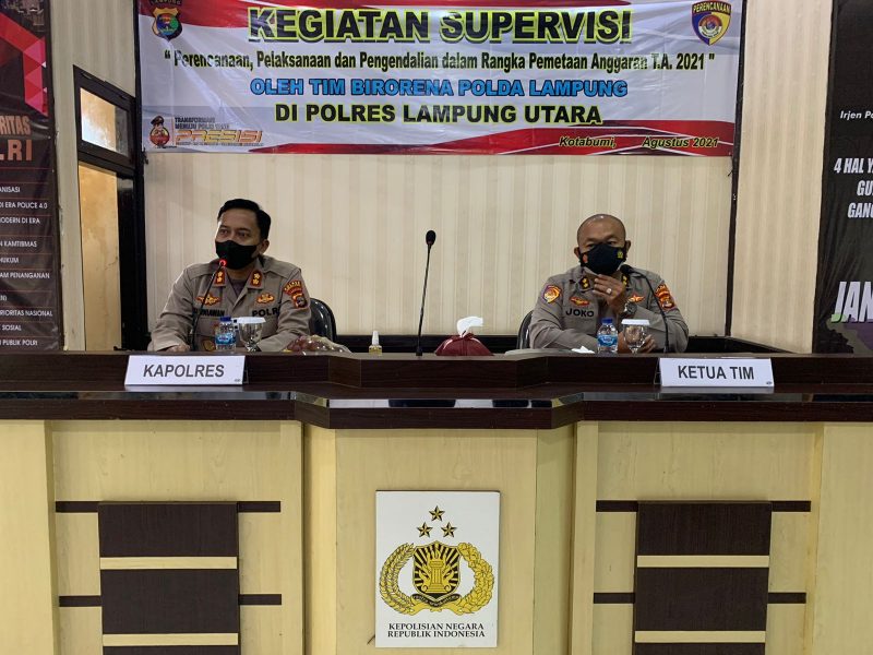 LAMPUNG UTARA (RNSI/SMSI) – Biro Rorena Polda Lampung menggelar supervisi di Polres Lampung Utara dalam rangka perencanaan, pelaksanaan dan pengendalian pemetaan anggaran tahun 2021, Kamis, 19 Agustus 2021.