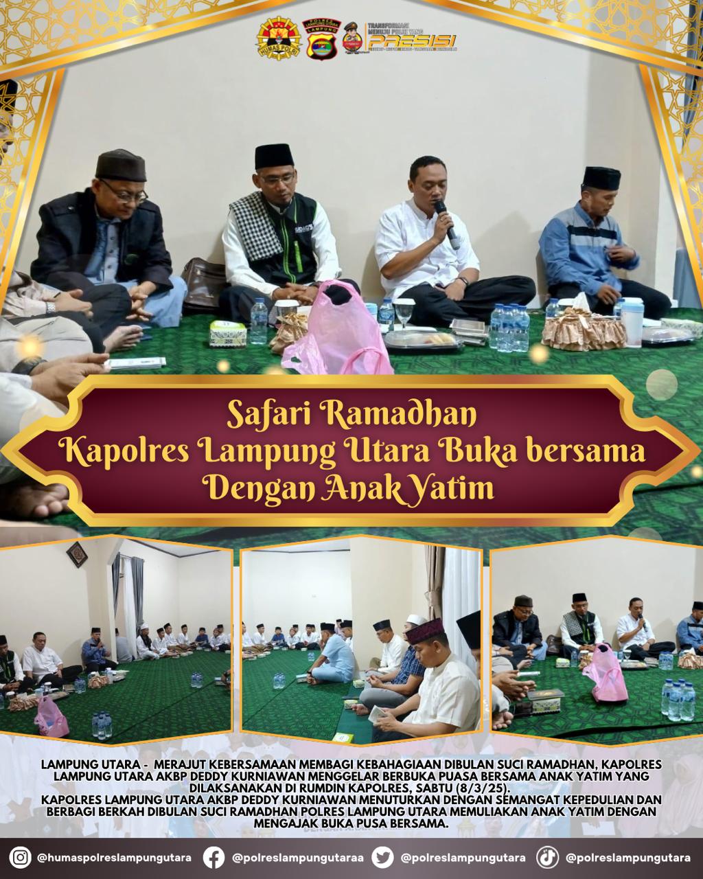 Kapolres Lampung Utara AKBP Deddy Kurniawan menuturkan dengan semangat kepedulian dan berbagi berkah di bulan suci Ramadan Polres Lampung Utara memuliakan anak yatim dengan mengajak buka pusa bersama.