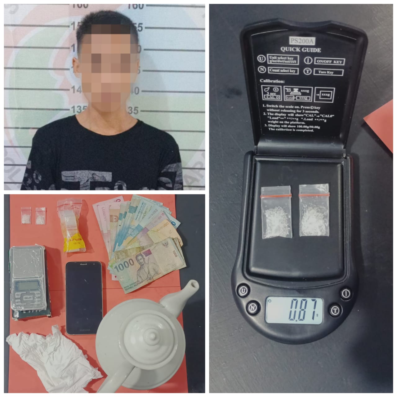 Dari tangan pelaku turut diamankan barang bukti (BB) berupa 2 (dua) plastik klip bening berisikan butiran kristal bening diduga narkotika golongan 1 jenis sabu dengan berat bruto 0,87 gr, uang tunai sejumlah Rp.988.000,- serta BB penyerta lainnya.