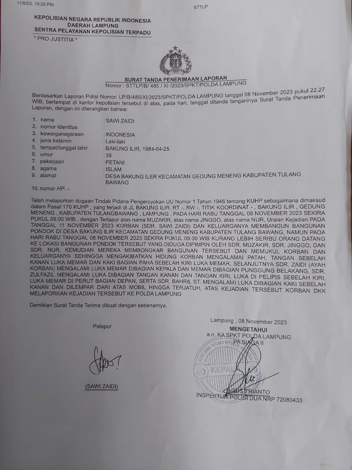 Pasca permasalahan tersebut Zaidi bersama warga telah melaporkan para pelaku penganiayaan ke Mapolda Lampung dengan nomor SPTL : STTLP/B/455/XI/2023/SPKT/Polda Lampung.