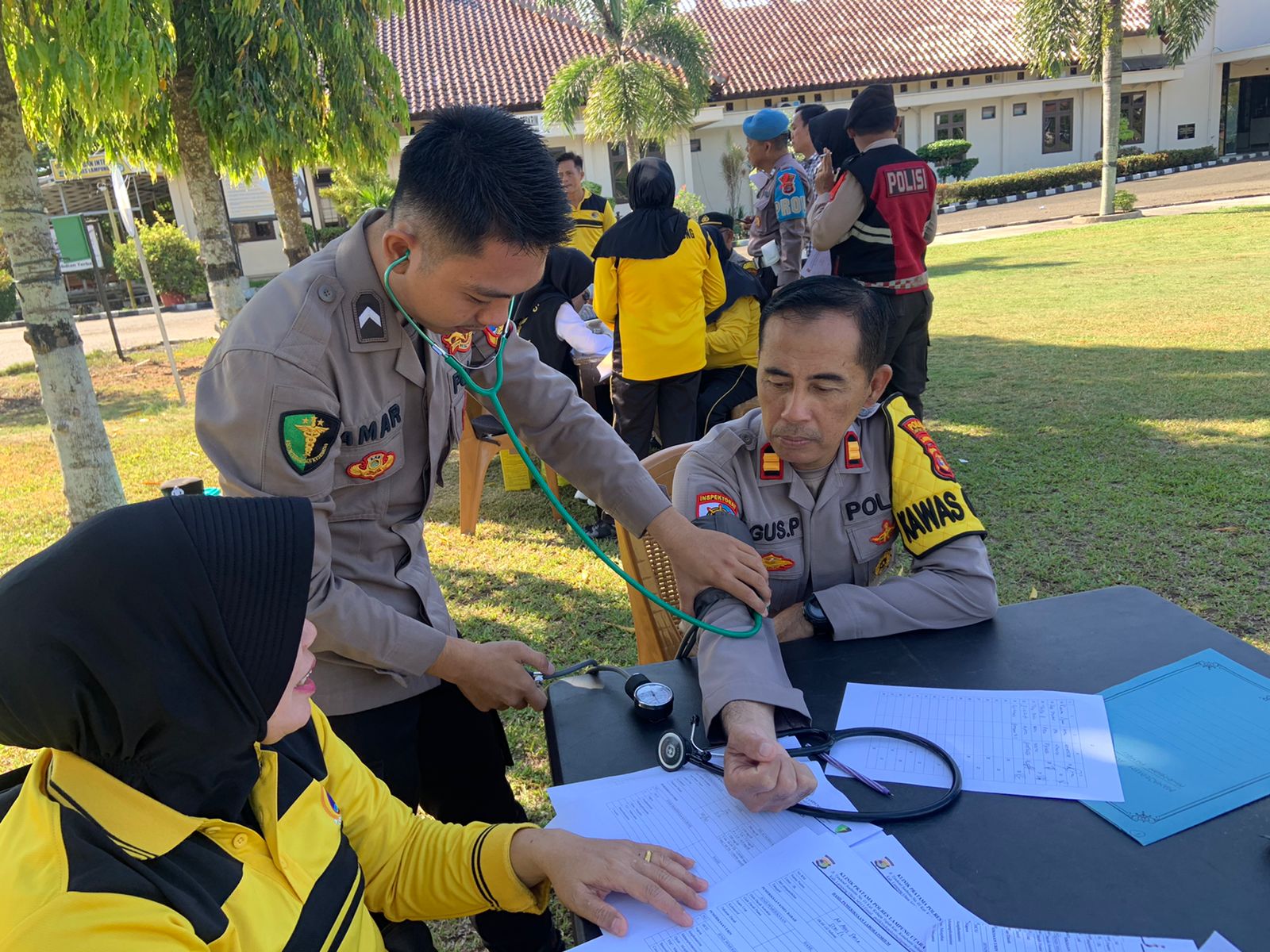 Pemeriksaan berupa pengecekan tekanan darah, gula darah, kolestrol, asam urat dan pemberian obat yang berlangsung di lapangan Mapolres.