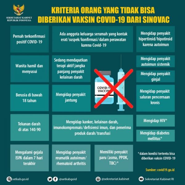 Berdasarkan informasi dari Satuan Tugas Penanganan Covid-19 yang diunggah pada akun media sosial twitter @setkabgoid, Sabtu (23/1/2021) Vaksin Covid-19 produksi Sinovac tidak dapat diberikan kepada kelompok masyarakat dengan kriteria berikut: