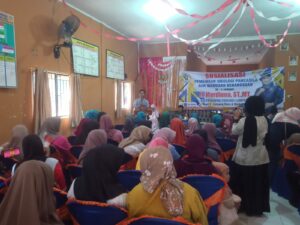 Penghujung acara, Ir. Mardiana, S.T., M.T., tampak membagikan buku sosialisasi, uang transportasi, serta bingkisan untuk seluruh audiens.