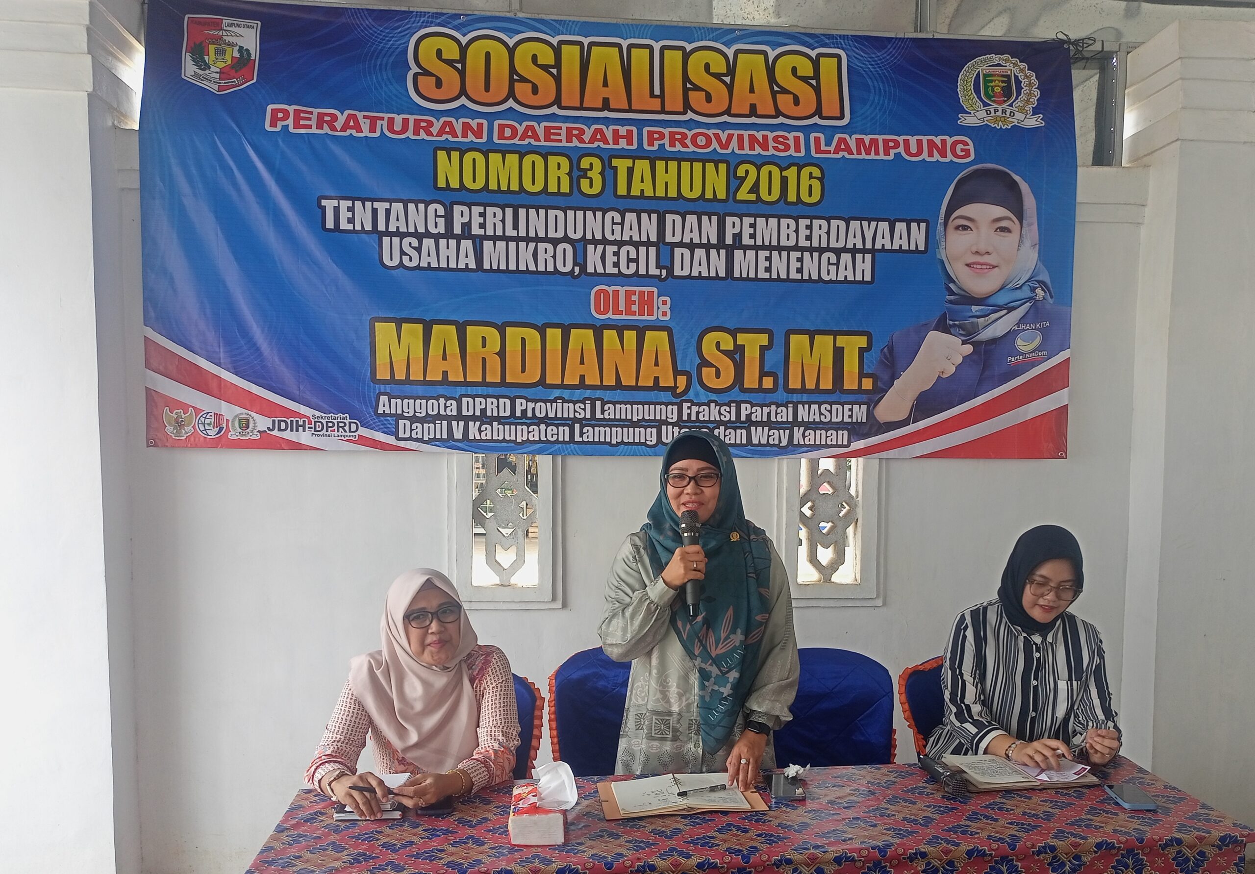 Untuk itu, anggota Komisi IV DPRD Provinsi Lampung , Ir. Mardiana, S.T., M.T., melangsungkan sosialisasi peraturan daerah nomor 3 tahun 2016 tentang Perlindungan dan Pemberdayaan Usaha Mikro Kecil dan Menengah.