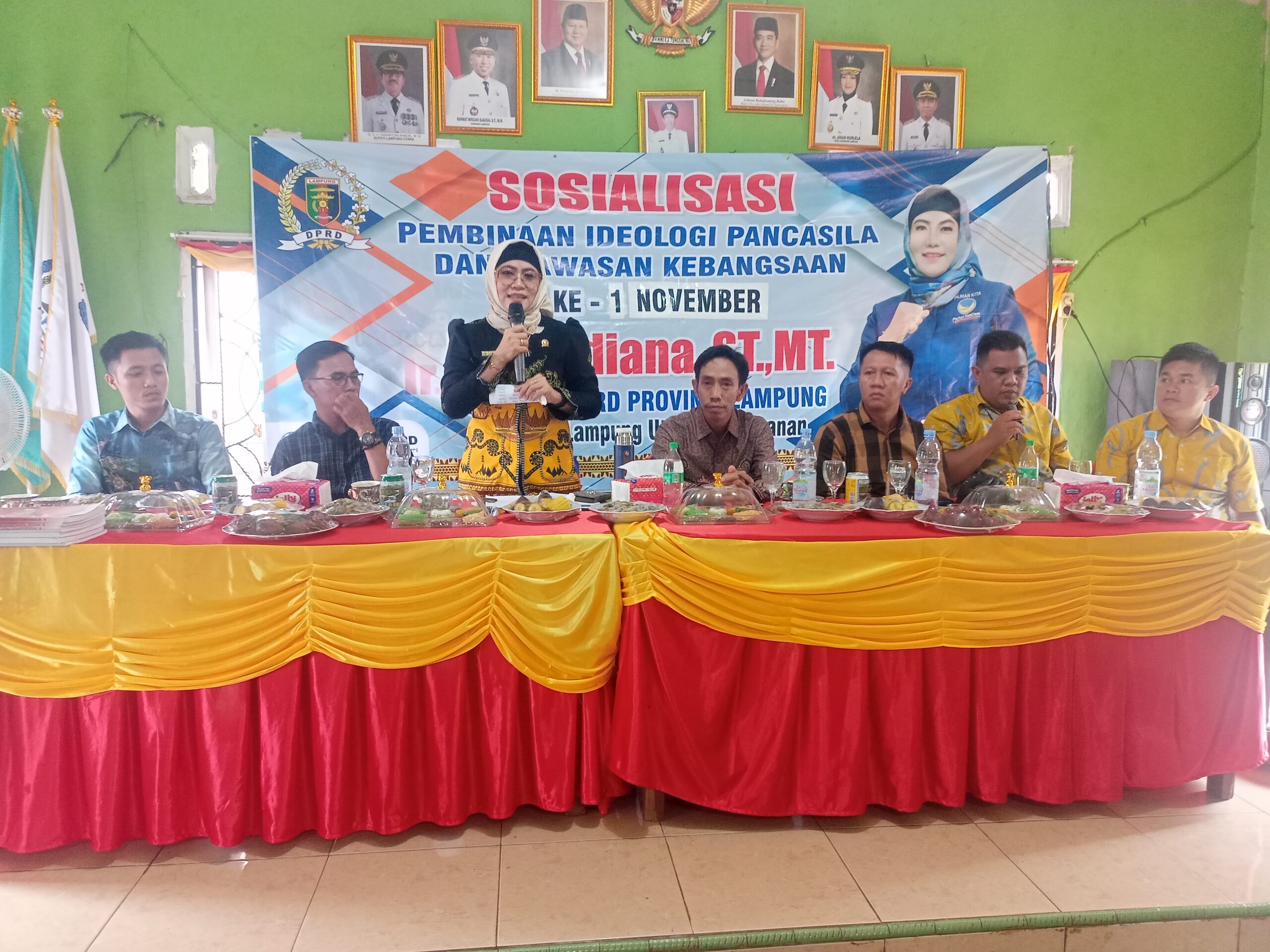 LAMPUNG UTARA (RNSI) – Wakil Ketua Komisi V DPRD Provinsi Lampung, Ir. Mardiana, S.T., M.T., melangsungkan kegiatan Sosialisasi Pembinaan Ideologi Pancasila dan Wawasan Kebangsaan (PIP-WK), pada Sabtu, 8 November 2025, terpusat di Desa Sindangmarga, Kecamatan Tanjungraja, Kabupaten Lampung Utara.