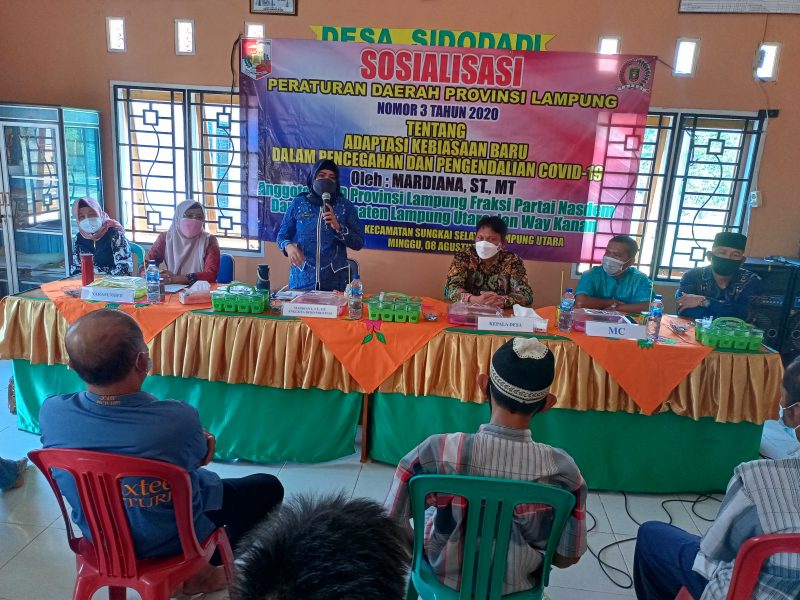 LAMPUNG UTARA (RNSI/SMSI) – Anggota DPRD Provinsi Lampung, Fraksi Partai NasDem, Mardiana, ST, MT, sosialisasikan Peraturan Daerah (Perda) Provinsi Lampung nomor 3 tahun 2020, tentang Adaptasi Kebiasaan Baru dalam Pencegahan dan Pengendalian Corona Virus Disease (Covid)-19, yang terpusat di Desa Sidodadi, Kecamatan Sungkai Selatan, Lampung Utara, Minggu, 8 Agustus 2021.