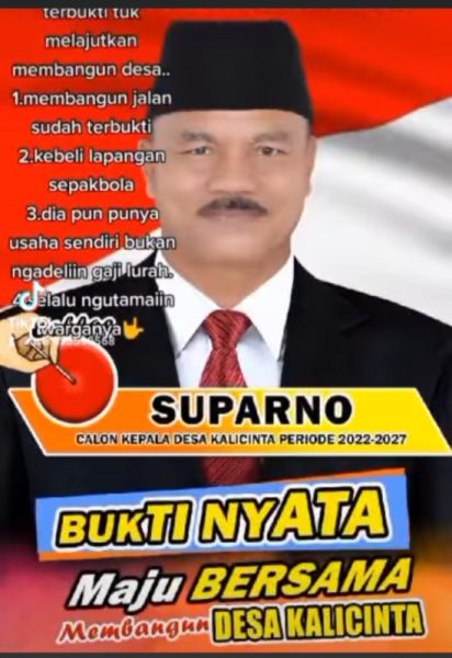 SUPARNO CALON KEPALA DESA KALICINTA PERIODE 2022-2027 PARIWARA 25/11/202126/11/2021Ardian syah AYO PILIH NOMOR TIGA (3) UNTUK KALICINTA YANG LEBIH MAJU DAN SEJAHTERA. SUDAH TERBUKTI Bagikan ini: Bagikan ke Telegram(Membuka di jendela yang baru) Telegram Bagikan pada Facebook(Membuka di jendela yang baru) Facebook Lagi Bagikan ke WhatsApp(Membuka di jendela yang baru) WhatsApp Baca Juga : SELAMAT dan SUKSES