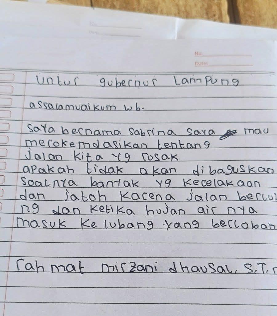 Lewat tulisan yang rapi dan bahasa yang sangat santun, anak-anak ini berani memohon perhatian khusus. Mereka mengadu soal kondisi jalan yang rusak parah, yang tak hanya menjadi akses sekolah mereka, tapi juga jalan menuju kampung halaman tercinta Ibunda Gubernur Lampung.