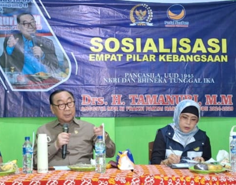 “Pancasila sebagai dasar dan ideologi negara, UUD 1945 sebagai konstitusi negara, NKRI sebagai bentuk negara, dan Bhineka Tunggal Ika sebagai semboyan negara. Empat pilar ini harus menjadi basis moral dan etika kehidupan seluruh lapisan masyarakat,” urai Hi. Tamanuri.