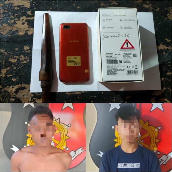 “Kini, kedua tersangka berikut barang bukti berupa 1 buah kotak HP merk OPPO A1k, 1 unit HP merk OPPO warna merah serta sebilah senjata tajam (sajam) sudah kita diamankan,” urainya, seraya menegaskan keduanya dapat dijerat dengan Pasal 365 KUHP.