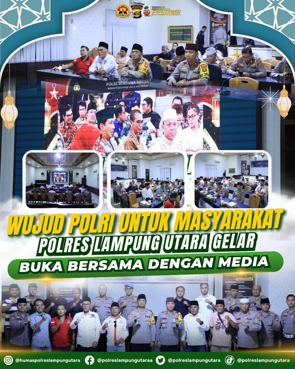 Kapolres Lampung Utara AKBP Deddy menyampaikan kegiatan ini dengan tema “Berbuka Puasa Polri Bersama Media Sebagai Wujud Polri Untuk Masyarakat” bertujuan untuk mempererat tali silahturahmi antara Polres Lampung Utara dengan media.