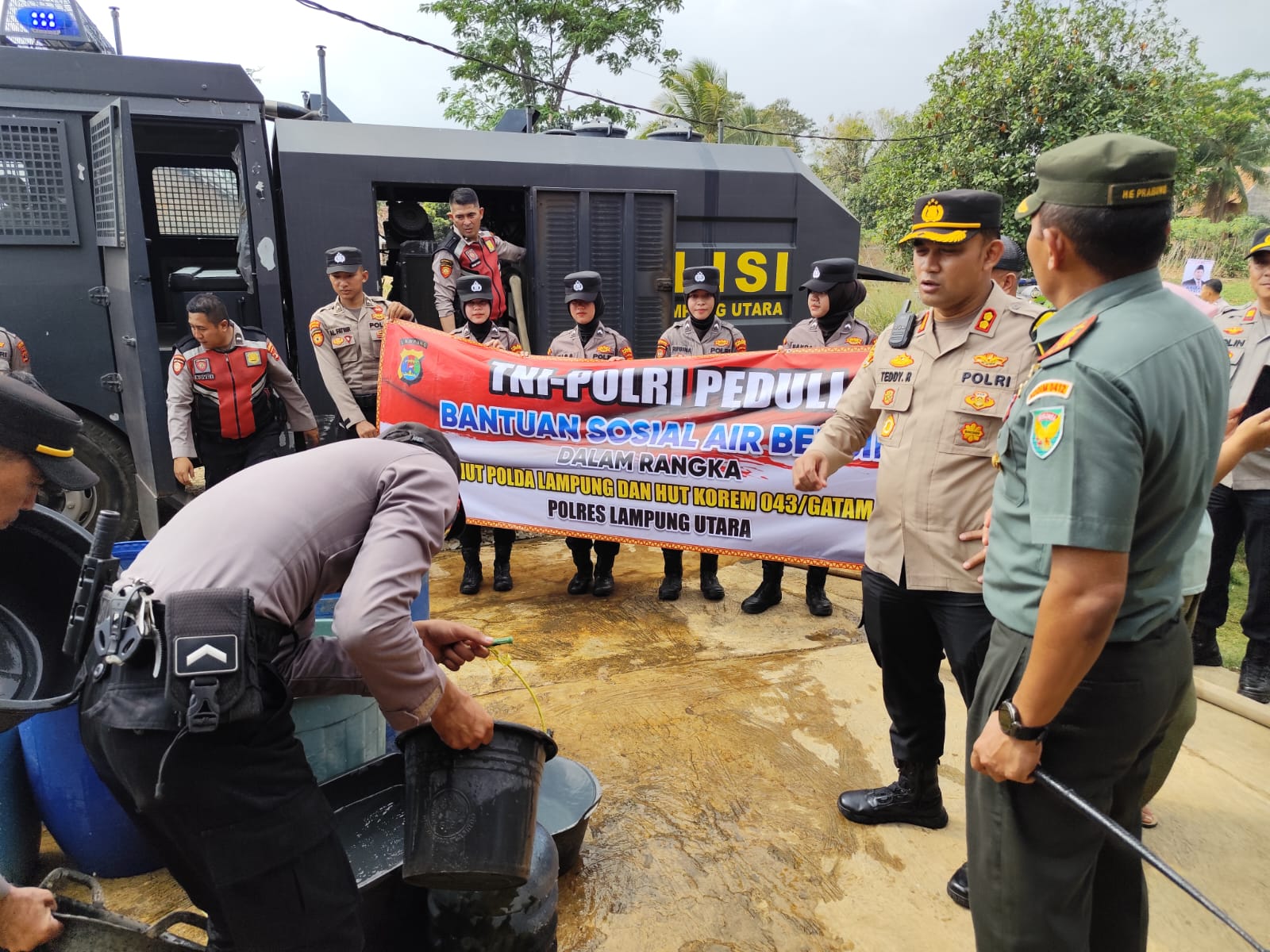 Kegiatan pembagian air bersih tersebut langsung dipimpin oleh Kapolres Lampung Utara AKBP Teddy Rachesna, S.H., S.I.K., M.Si. bersama dengan Dandim 0412/LU Letkol Inf. Hery Eko Prabowo.