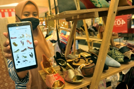 Caption Foto Utama : Pelaku usaha menunjukkan katalog digital produknya. Foto : Antara Foto/ Fenny Selly.
