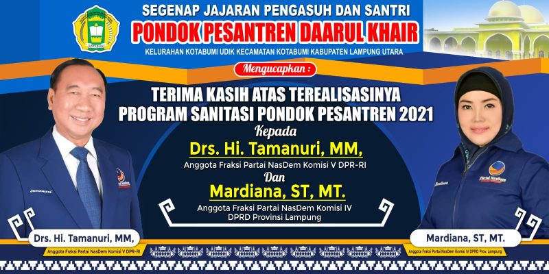 Segenap Jajaran Pengasuh dan Santri Pondok Pesantren Daarul Khair Kelurahan Kotabumi Udik Kecamatan Kotabumi Kabupaten Lampung Utara Mengucapkan Terimakasih Kepada Bapak Drs. Hi. Tamanuri, MM, (Anggota Fraksi Partai NasDem Komisi V DPR-RI) dan Ibu Mardiana, ST, MT., (Anggota Fraksi Partai NasDem Komisi IV DPRD Provinsi Lampung) Atas Terealisasinya Program Sanitasi Pondok Pesantren 2021