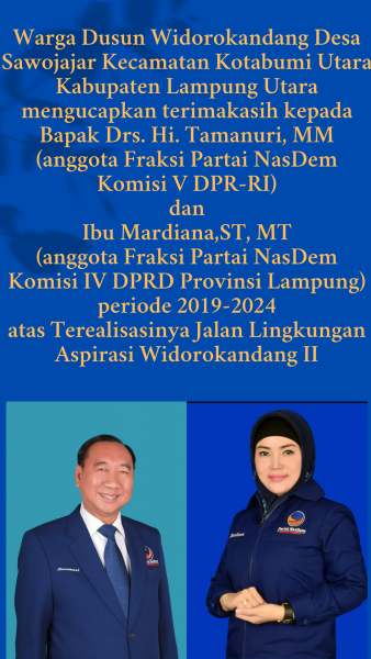 Warga Dusun Widorokandang, Desa Sawojajar, Kecamatan Kotabumi Utara, Kabupaten Lampung Utara, Mengucapkan Terimakasih kepada Bapak Drs. Hi. Tamanuri, MM, (anggota Fraksi Partai NasDem Komisi V DPR-RI) dan Ibu Mardiana, ST, MT, (anggota Fraksi Partai NasDem Komisi IV DPRD Provinsi Lampung), Periode 2019-2024, atas Terealisasinya Aspirasi Jalan Lingkungan Widorokandang II